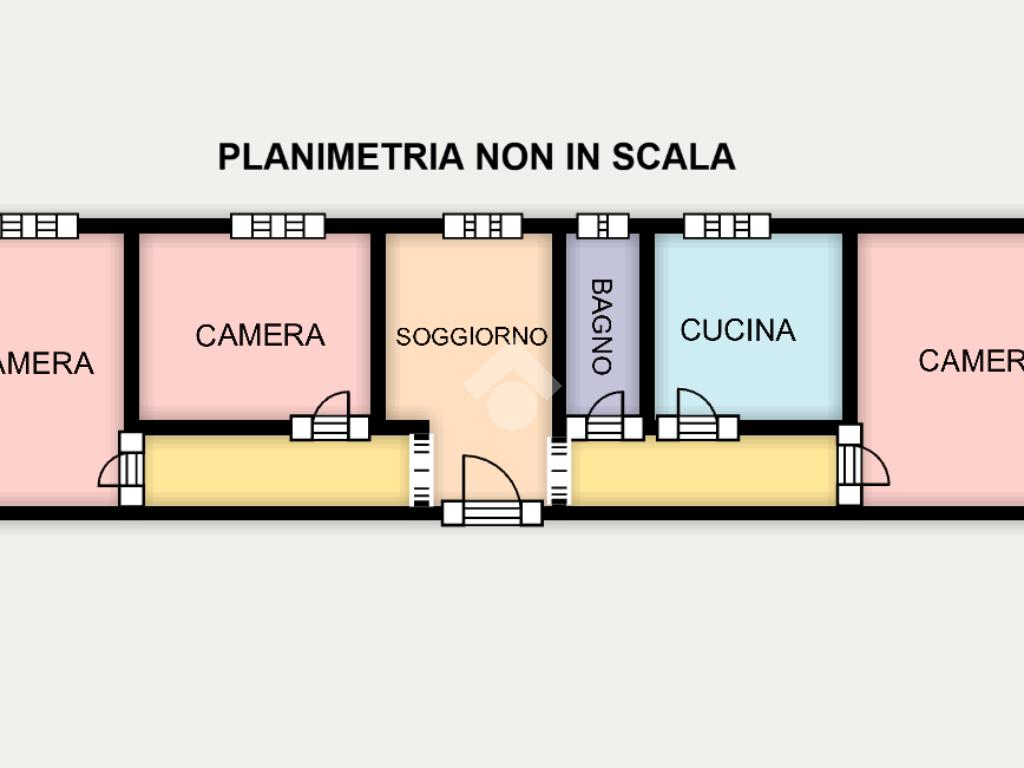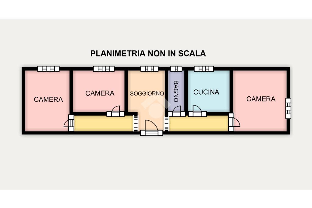 L'immobile al suo interno si presenta in stato da ristrutturare ed entrando troviamo subito il soggiorno con doppio corridoio ai lati per raggiungere tutti gli altri vani, ovvero le 3 camere da letto, la cucina abitabile e il bagno finestrato con vasca.