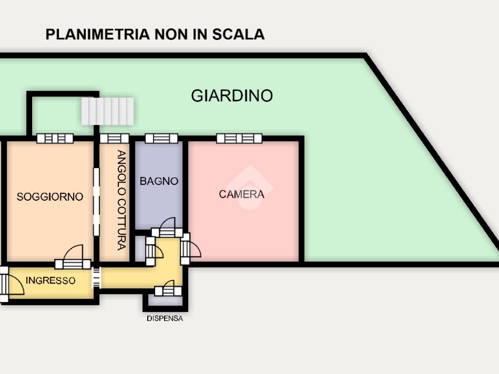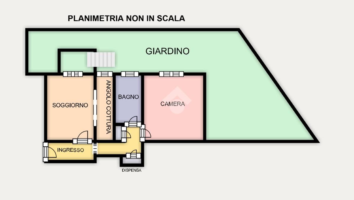 L'immobile oggetto di vendita si presenta in buono stato interno, composto da un ingresso arredabile collegato al soggiorno con angolo cottura e uscita verso l'ampio giardino terrazzato di circa 50mq. Proseguendo verso il corridoio troviamo la dispensa, il bagno finestrato con box doccia e la camera da letto matrimoniale.